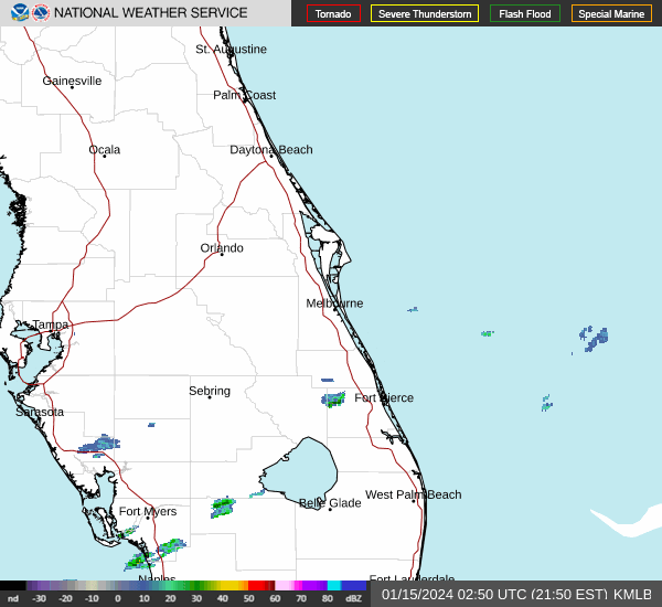 Pembaruan 19:15: Lingkaran radar Layanan Cuaca Nasional menunjukkan garis hujan secara bertahap meruncing ke selatan dari Cape Canaveral.