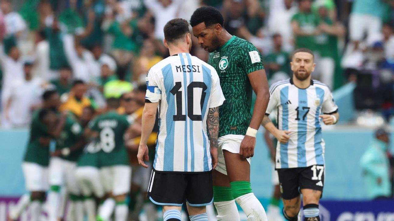 pemain Kerajaan Arab Saudi Ali Al-Bulayhi Dia membintangi salah satu foto hari ini, Selasaketika pasangan Anda Salem Al-Dosari Membedakan 1-2 Dalam pandangan Argentina Pada menit ke-53 dia nyaris saja Lionel Messi Dia membuat dua pukulan di punggungnya, dan mengulangi beberapa kali, di dekat wajahnya, sebuah pesan misterius.